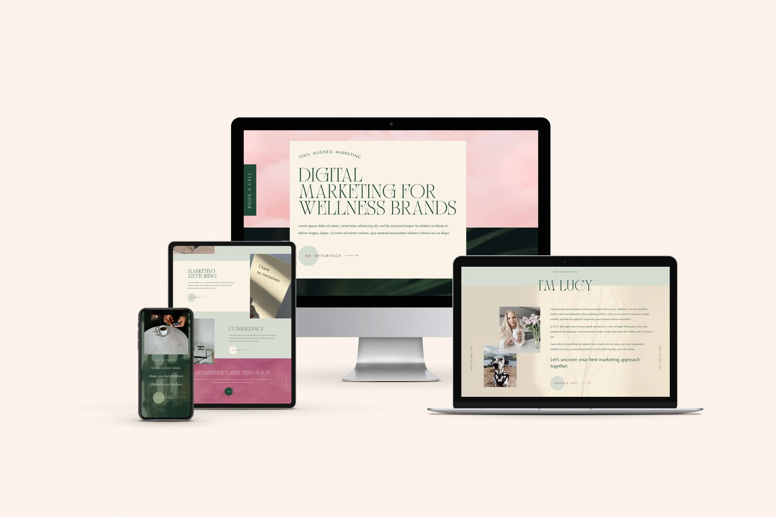 As such, we knew the aesthetics needed to reflect the intended customer experience: calm, conscious and considered. We chose a colour palette consisting of soft, pastel shades, as well as earthy colours such as luscious, leafy greens to communicate the brands focus on holistic, natural approaches to business. We included imagery of crystals, sage and clouds to further the welcoming impression of wellness.