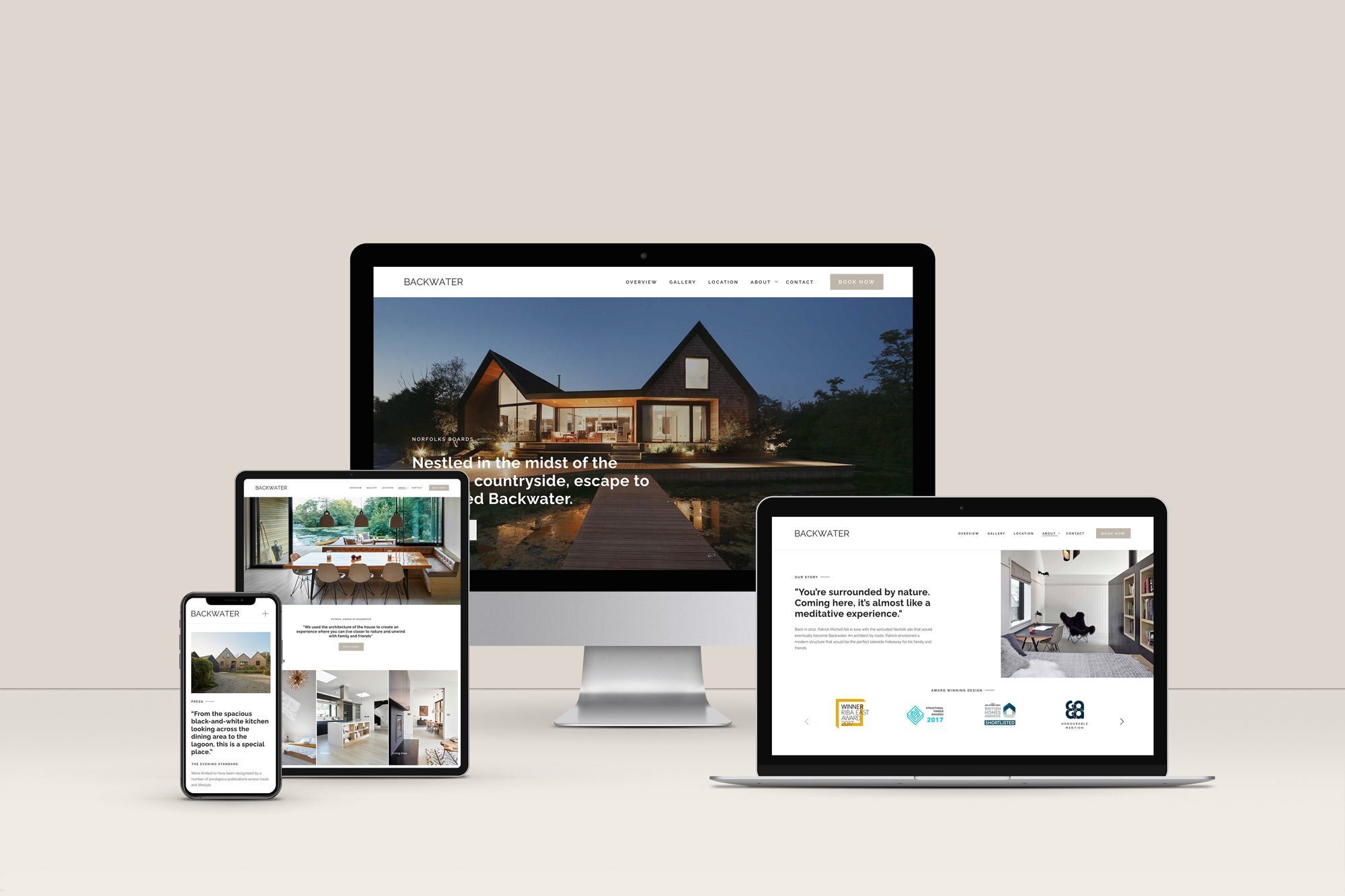 For Backwater, a key deliverable was to create a website which reflected the craftsmanship, magnificence and tranquility of the retreat.