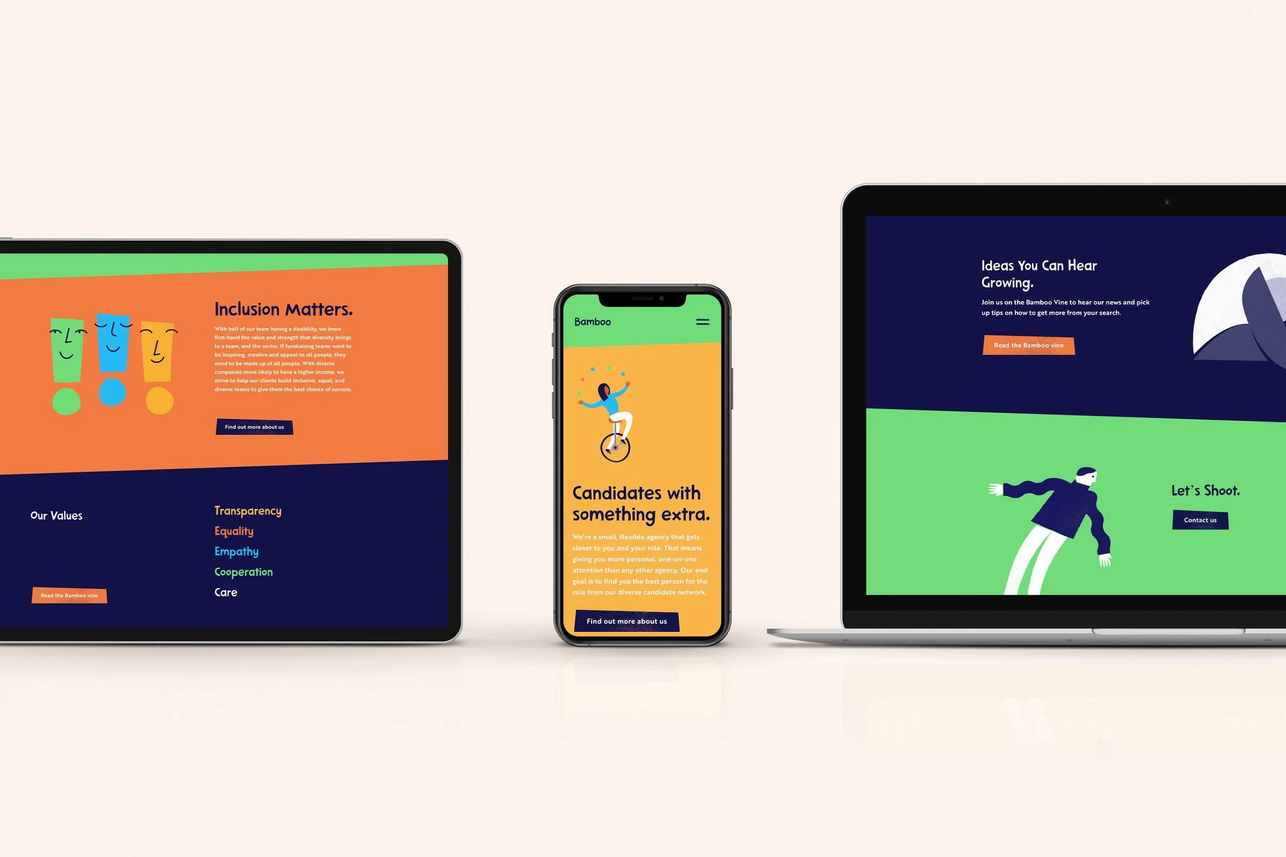 Bamboo wanted an easy-to-navigate Squarespace website that showcased all the available jobs they were recruiting for, useful blog content that they have written for both employees and employers, as well as showcasing the brand's personality.