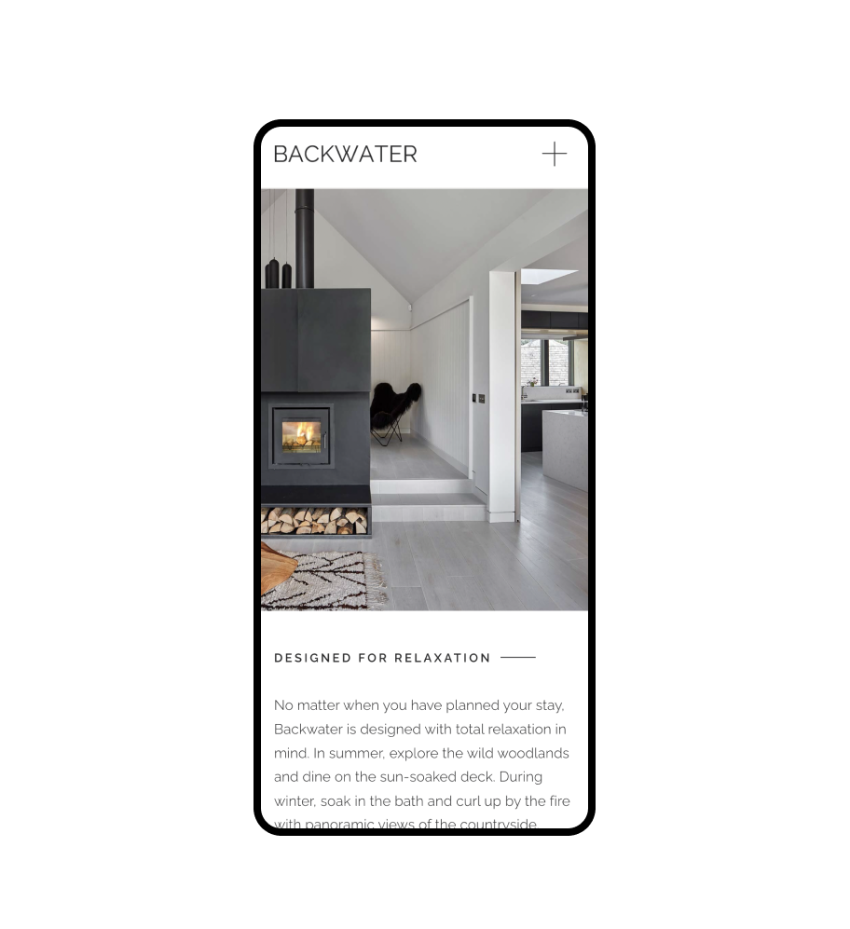 Backwater's intention is to give their customers a taste of a slower life, rooted in nature. As a result, it was important for the website design and user experience to reflect their brand essence, and give prospective customers a sense of what they could expect from a stay at Backwater.