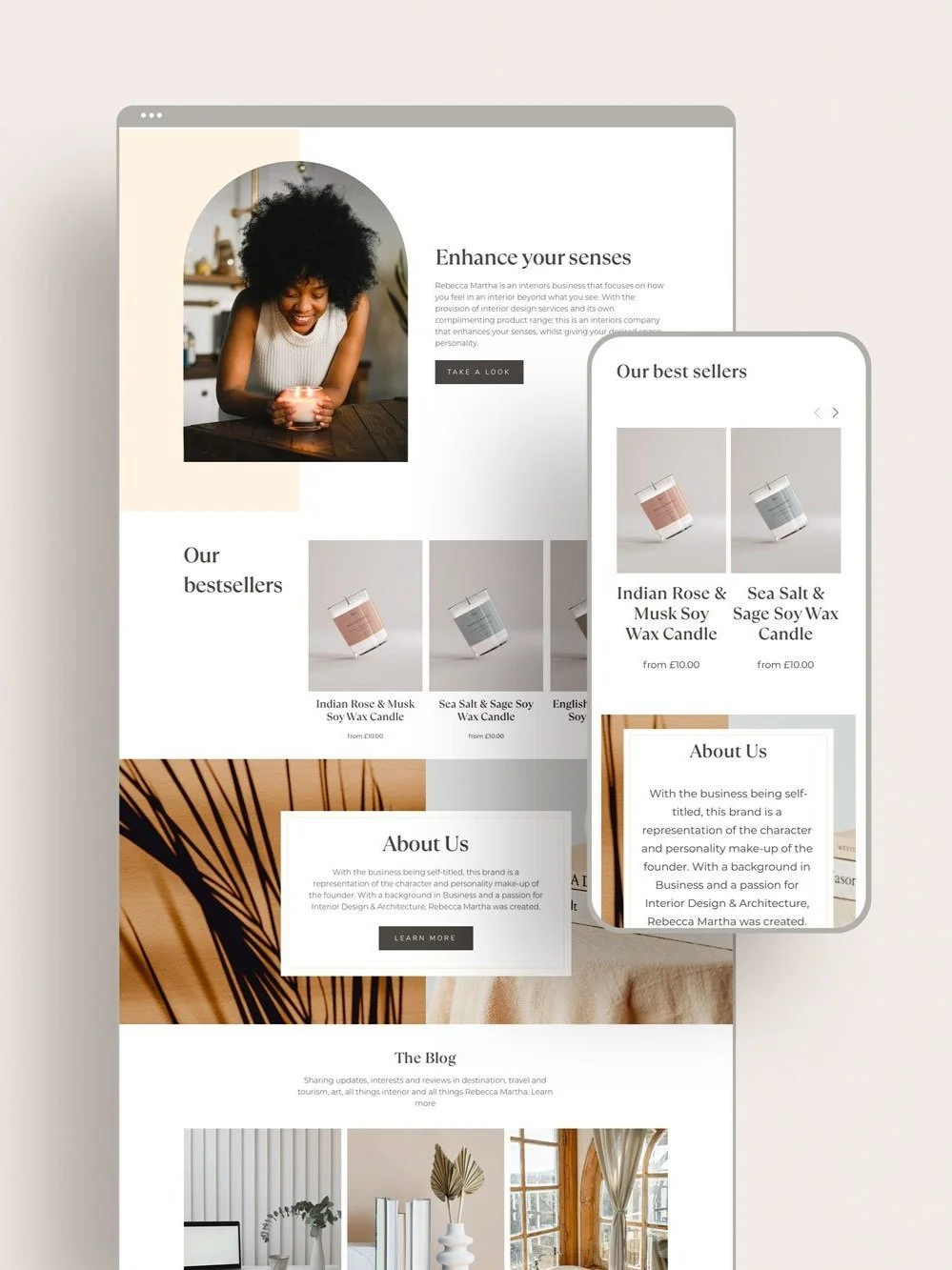 Rebecca Martha Interiors’s Squarespace website objectives were to have a website that reflects the luxury and simplicity of the brand, which will compel users to purchase, increase repeat visits to the site, by using a blog to create a sense of community and increase sales on the website.